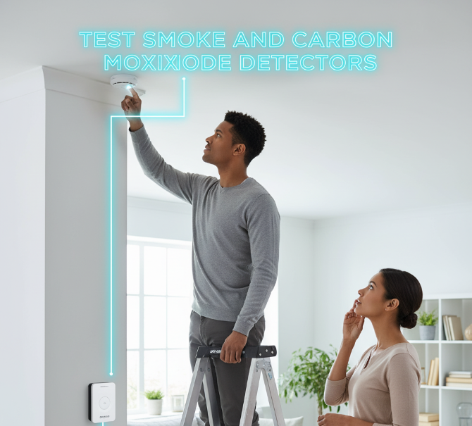 - Test smoke and carbon monoxide detectors, replacing batteries and units as needed to ensure safety.