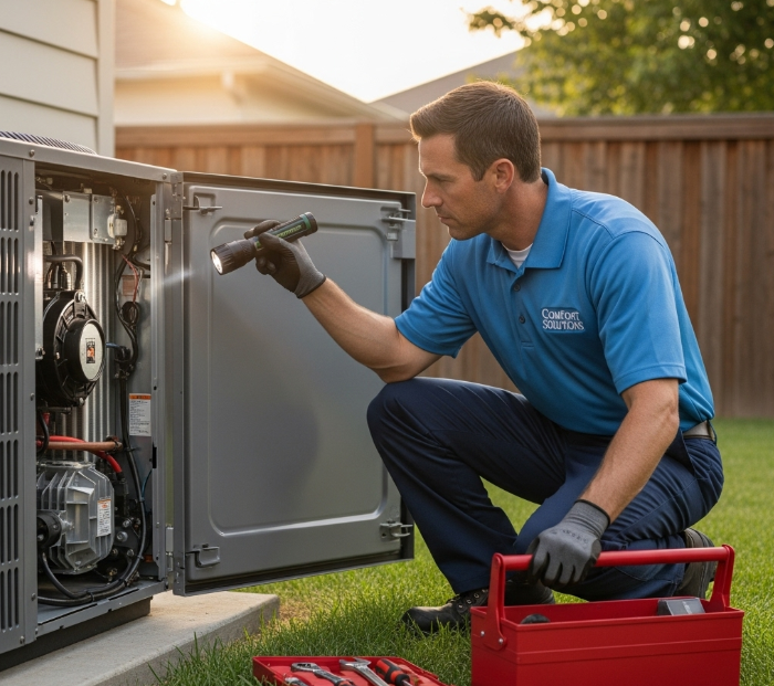 One key task is air filter replacement; a clean filter improves airflow and reduces strain on your system. Check and replace it every 1-3 months, especially during peak seasons.