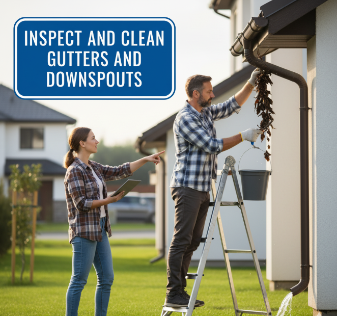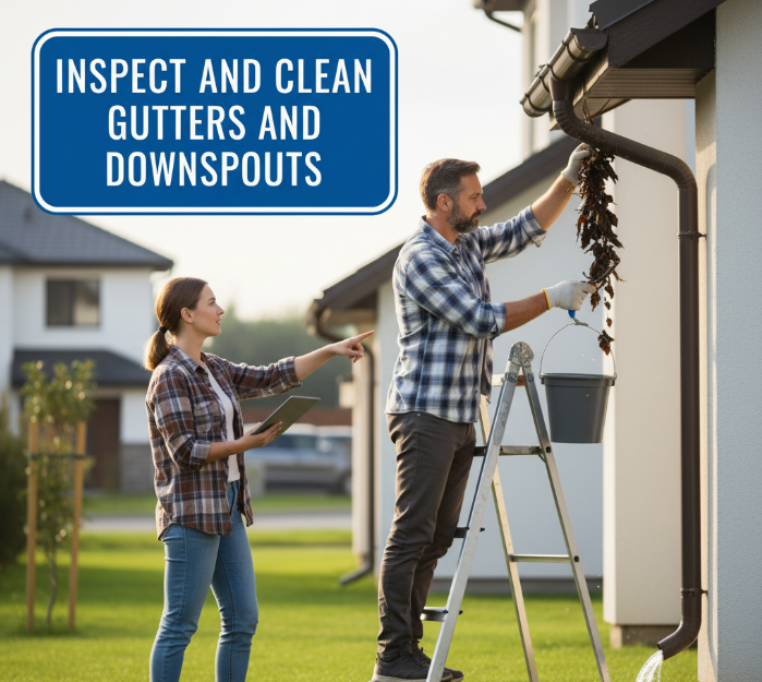 • Inspect and clean gutters and downspouts to prevent water damage and keep pests at bay.