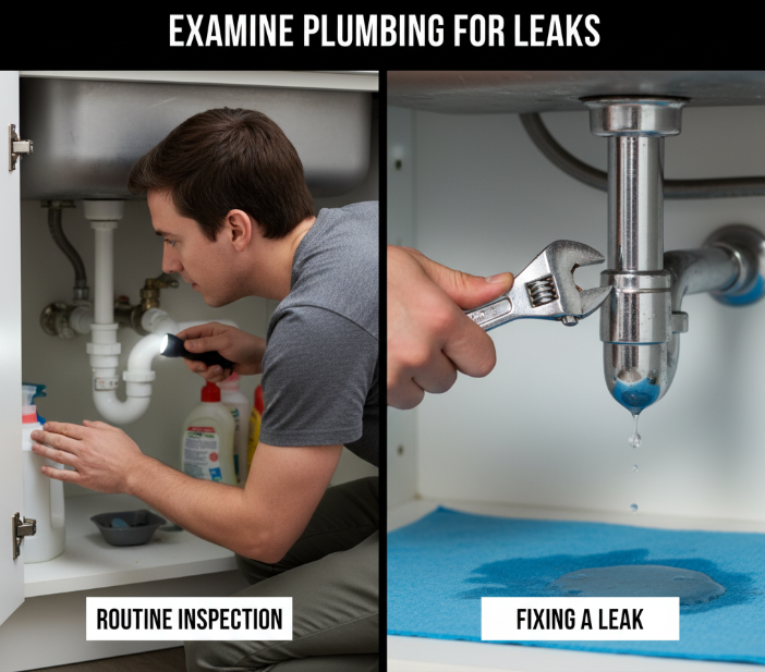 Start with leak detection by inspecting visible pipes, faucets, and fixtures for moisture. Don’t forget to check under sinks and around appliances.